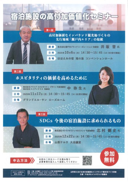 やまがたインバウンド協議会様で主催され、全3回で開催されております宿泊施設の高付加価値化セミナーの第2回として『ホスピタリティの価値を高めるために』を題材として鶴岡にてセミナーが開催されます。講師や会場等は以下のとおりです。