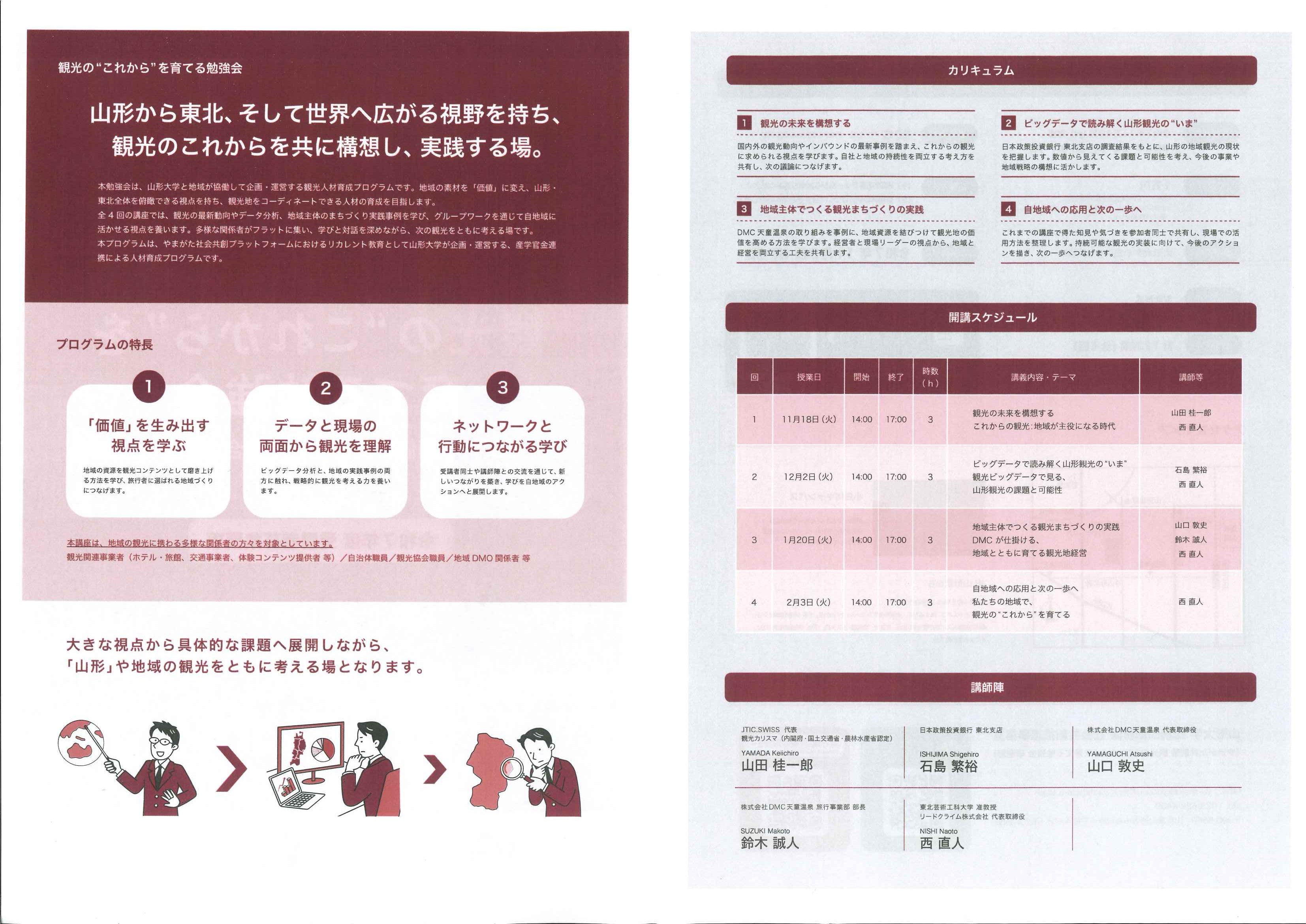 この勉強会は、山形大学と地域が協働して企画・運営する観光人材育成プログラムです。地域の素材を「価値」に変え、山形・東北全体を俯瞰できる支店を持ち、観光地をコーディネートできる人材の育成を目指し、全4回の講座にて自地域に活かせる視点を養うものとなっております。プログラムの概要は以下のとおりです。